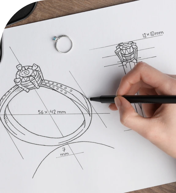 Your designer collaborates extensively with our team of expert goldsmiths, led by Brian—a master craftsman with over 40 years of experience. Together, they determine precisely how your bespoke ring should be brought to life. You’ll receive detailed sketches showing your design from multiple angles, available for you to review online at your convenience.